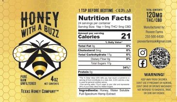 THC and CBD infused honey. Standard serving size is 1 tsp, 24 servings per container.